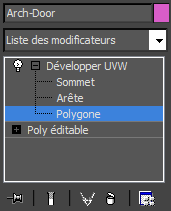 - Dans la pile des modificateurs, dans la hiérarchie du modificateur Développer UVW, cliquez sur Polygone pour atteindre le niveau sous-objet Polygone.
