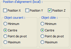 zone Position d'alignement (Local), désactivez les cases Position X et Position Y, cochez la case Position Z et, dans les sous-groupes Objet courant et Objet cible, choisissez Centre. Cliquez sur OK.