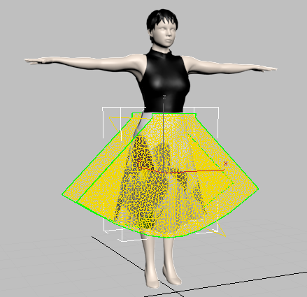 Les fenêtres 3ds Max affichent la jupe sous la forme des maillages plats créés par le modificateur Fabricant de vêtement.