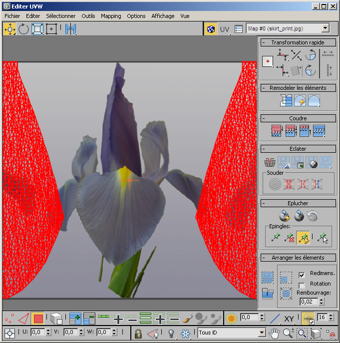 Chaque groupe de fonctions de la jupe apparaît dans la fenêtre Editer UVW comme un cluster plat, mis en surbrillance en rouge car il est sélectionné.