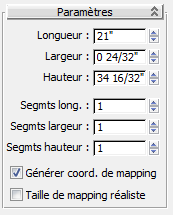 groupe de fonctions Modifier puis, dans le panneau déroulant Paramètres, entrez 21,0 dans le champ Longueur, 0,75 dans le champ Largeur sur 34,5 dans le champ Hauteur. Dès que vous saisissez les valeurs, elles sont converties en pouces et en fractions de 1/32 de pouce, selon la configuration des unités définie dans le fichier de scène.