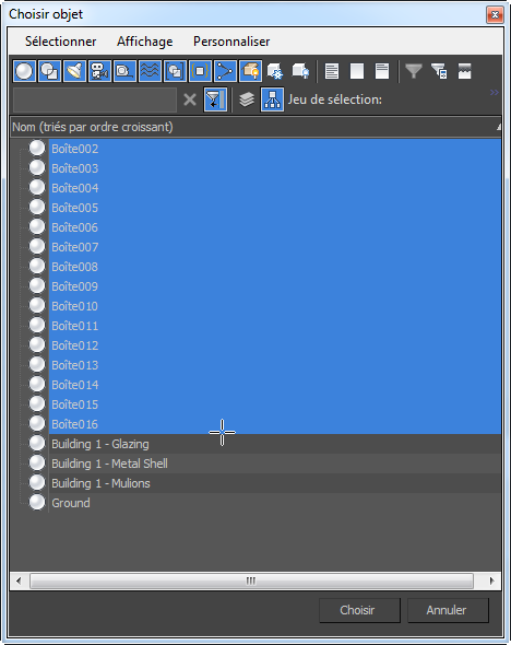 - Appuyez sur la touche H pour ouvrir la boîte de dialogue Choisir objet. Dans la liste, sélectionnez tous les objets Box, puis cliquez sur Choisir.