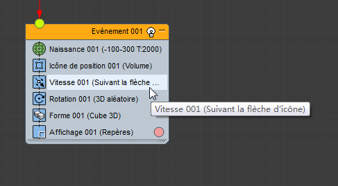 Vue particule est l'interface principale des systèmes de flux de particules. C'est là que vous ajoutez et ajustez le comportement des particules. Les principales zones de cette fenêtre sont la zone d'affichage des événements, dans la partie supérieure gauche, qui affiche les événements que vous venez de créer, et la zone de "dépôt", en bas à gauche, qui contient les opérateurs que vous pouvez ajouter dans la zone d'affichage des événements.