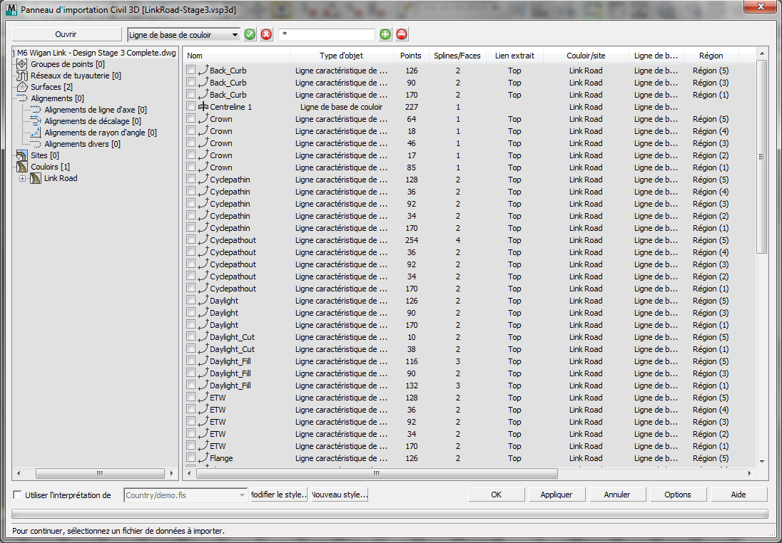 3ds Max ouvre le panneau d'importation Civil 3D.