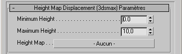 - Cliquez deux fois sur le noeud Height Map Displacement afin d'en afficher les paramètres et, dans le panneau déroulant Height Map Displacement, remplacez la valeur du paramètre Minimum Height (Hauteur minimale) par 0,0.