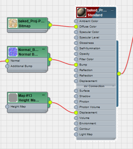 - Cliquez sur le signe plus (+) du noeud du matériau baked_Proj-Plane_mtl pour ouvrir la zone "mr Connection", puis reliez le noeud Height Map Displacement vers le composant "mr Connection : Déplacement" du matériau ancré.