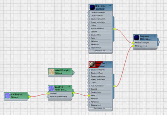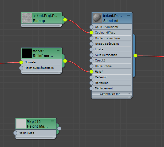 zoom pour avoir une vue satisfaisante du noeud du matériau baked_Proj-Plane_mtl / Standard et du nouveau noeud Height Map Displacement.