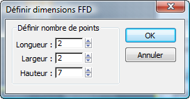 - Dans la boîte de dialogue Set FFD Dimensions (Définir dimensions FFD), définissez les paramètres de la façon suivante pour fixer le nombre de points de contrôle applicables au treillis utilisé pour déformer la structure: