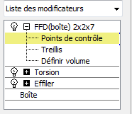 du signe plus pour développer l'arborescence du modificateur FFD(boîte). Cliquez pour choisir des points de contrôle. Vous pouvez ainsi sélectionner et manipuler les points de contrôle du treillis que vous avez définis à l'étape précédente.
