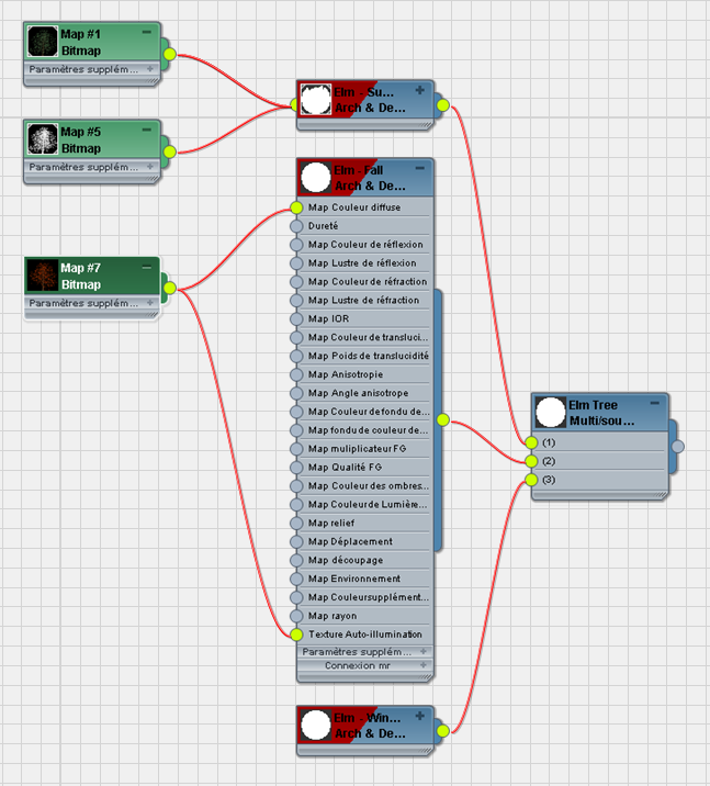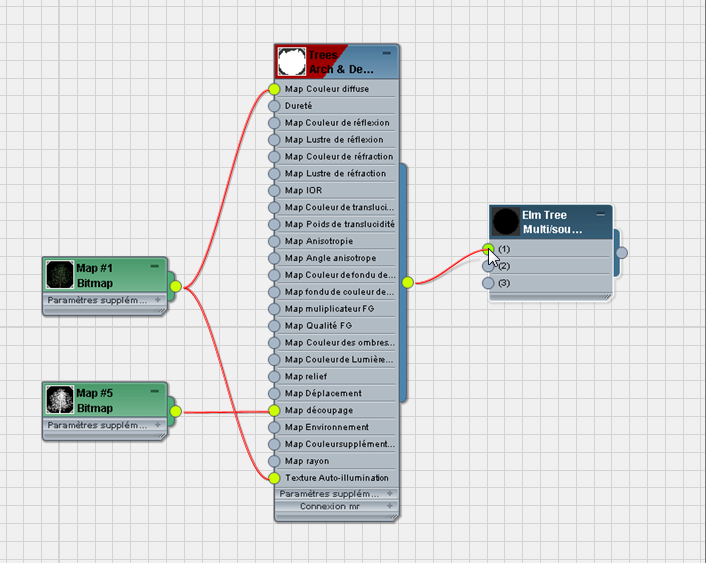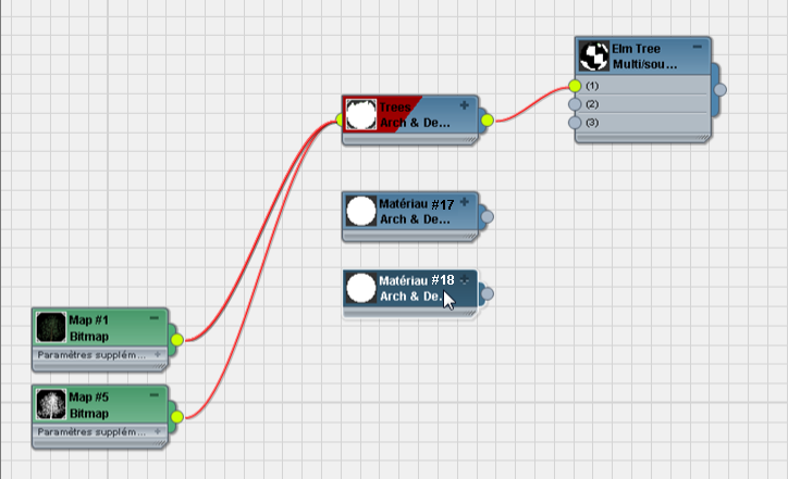 - Liez les deuxième et troisième nœuds du matériau aux sockets (2) et (3) du nœud du matériau Elm Trees pour qu'ils deviennent des sous-matériaux.