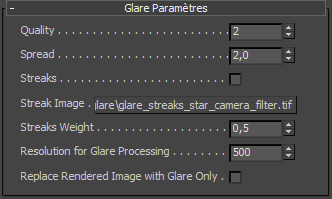 Valeur absolue spécifiant la taille de l'image, en pixels, sur laquelle se produit le calcul Glare (éclat). Si votre image est rendue à 5000 x 5000 et que la Résolution pour le traitement de l'éclat est défini à 350, Glare (éclat) se calculera effectivement sur une image 350 x 350 en interne et sera à nouveau appliqué sur l'image finale, produisant probablement ainsi un effet d'éclat inapproprié.