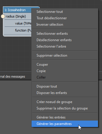 Ce noeud contient les fonctionnalités de base permettant de créer un objet icosaèdre. Notez qu'il dispose d'un connecteur d'entrée sur le côté gauche, intitulé "rayon (unique)" et, dans la partie droite, d'un connecteur de sortie, intitulé "valeur (TriMesh)". (Le connecteur de fonction n'est pas utilisé dans cette procédure). Comme vous pouvez le voir, la logique va de gauche à droite. C'est le cas pour tous les graphiques MCG.