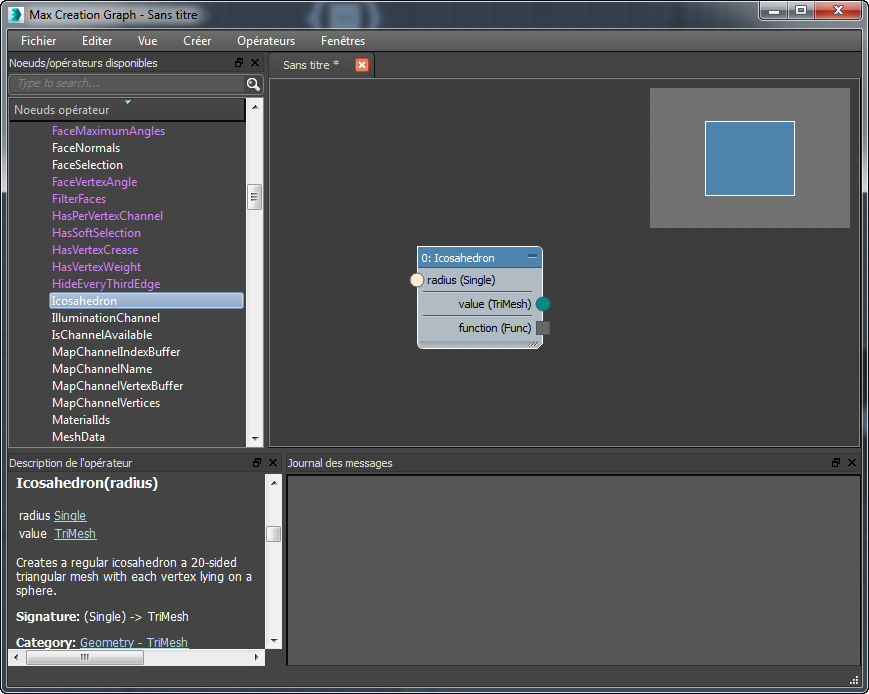 La boîte de dialogue de l'éditeur Max Creation Graph s'ouvre. Il se compose d'une barre de menus et de quatre fenêtres : Noeuds/opérateurs disponibles, Description de l'opérateur, Journal des messages et la fenêtre principale du graphique, comportement pour l'instant un seul onglet appelé "Sans titre".