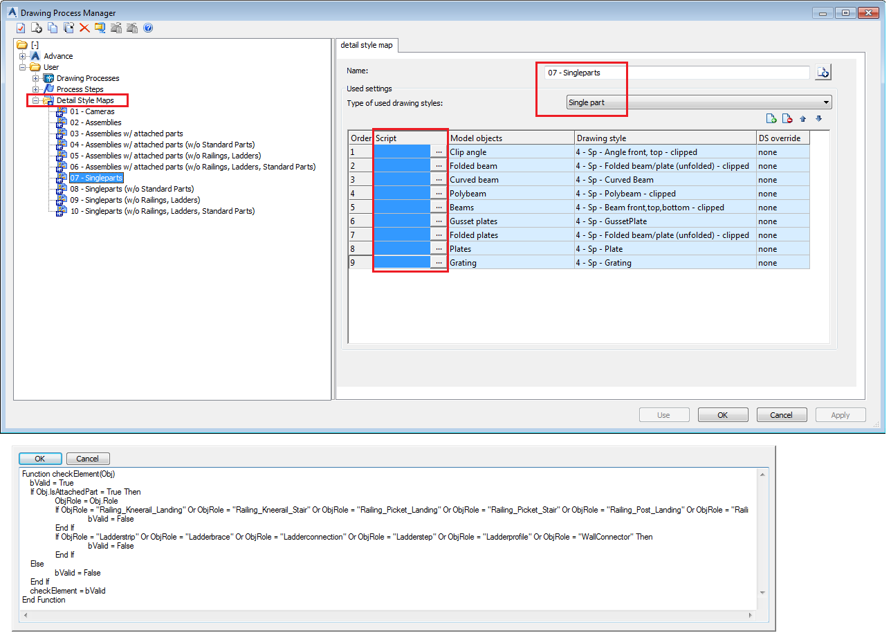 Le contenu Script dans les Styles par famille d'objets du Gestionnaire du plan de fabrication a été rempli et simplifié :