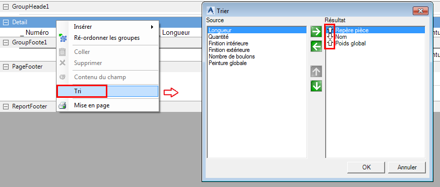 Le contenu d'une nomenclature externe peut être trié en fonction de plusieurs critères. Pour chacun de ces critères, vous pouvez appliquer un autre ordre de tri (croissant ou décroissant) à l'aide des icônes de flèche correspondantes.
