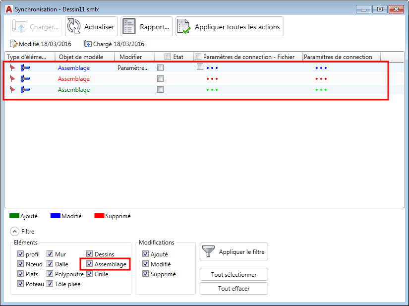 Les assemblages qui seront créés sont signalés par une ligne verte, les assemblages qui seront supprimés seront signalés par une ligne rouge et ceux qui seront modifiés sont signalés par une ligne bleue.