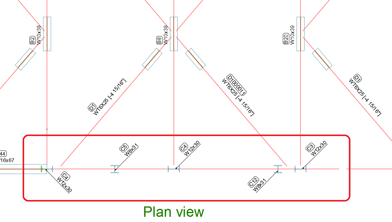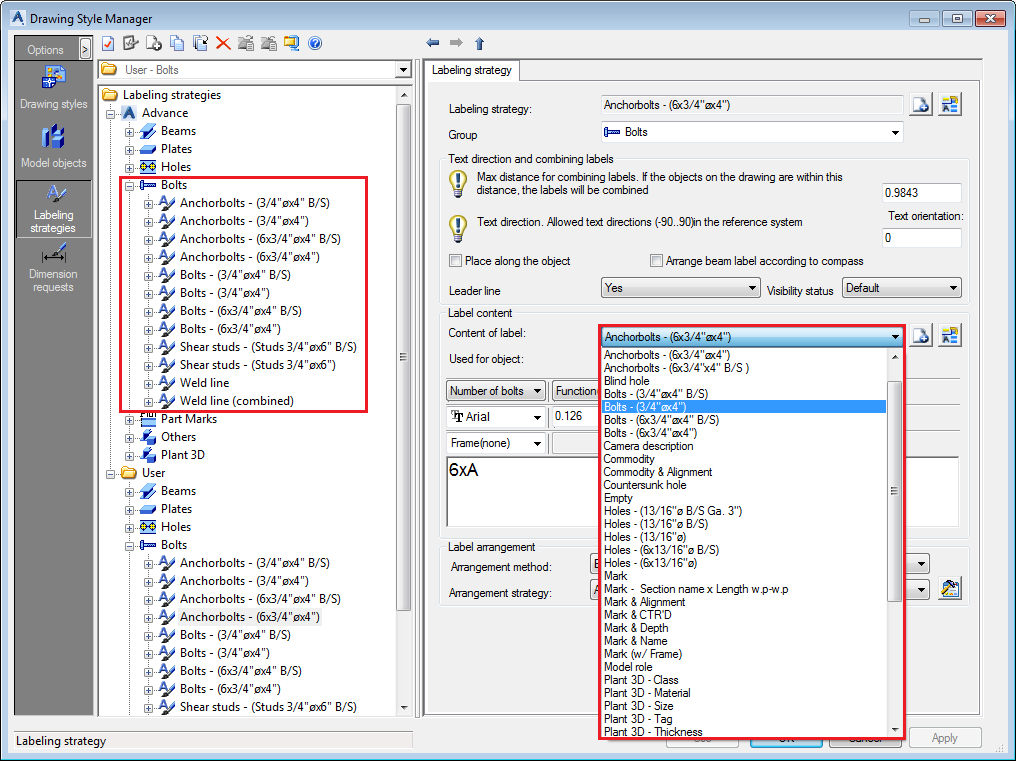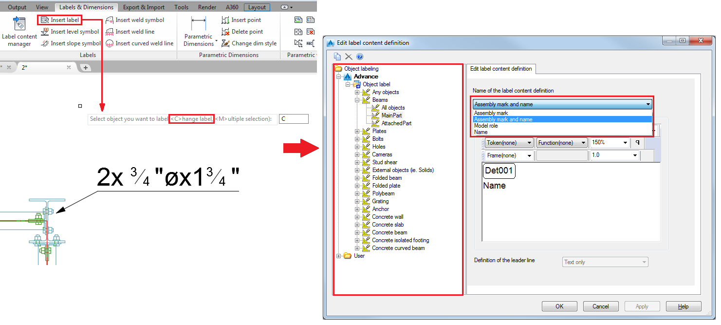 Vous pouvez ajouter des labels manuels sur n'importe quel type de détail (plan, vue d'élévation, assemblage ou pièce secondaire). Le contenu du label dépend du type de l'objet vers lequel l'étiquette pointe (poutre, tôle, etc.). et de son état (assemblage, pièce attachée, etc.). Vous pouvez modifier le contenu de chaque label, en accédant à la boîte de dialogue Définition du contenu du label (appuyez sur C et sur la touche Entrée après l'exécution de la commande de label manuel).