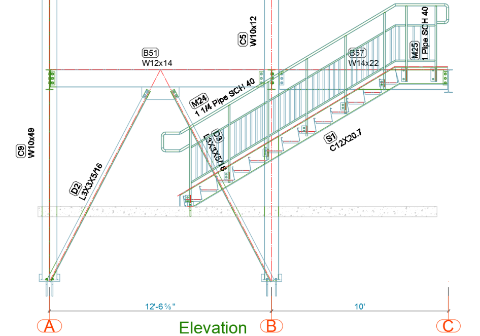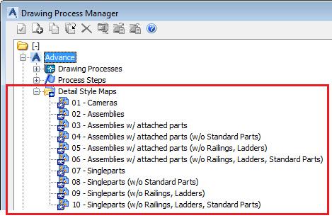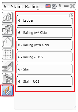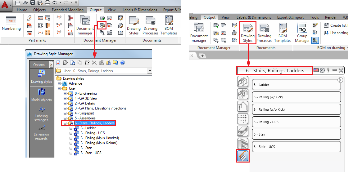 Les styles de détails dédiés aux escaliers, garde-corps et échelles sont disponibles dans la palette de styles de dessin ou dans le Gestionnaire de styles de dessin. Certains styles de dessin offrent la possibilité d'être détaillés en fonction de l'emplacement du SCU dans le modèle 3D (orientation de l'axe Z et position du plan XY). Ces styles de dessin ont la dénomination "SCU" dans leurs noms.