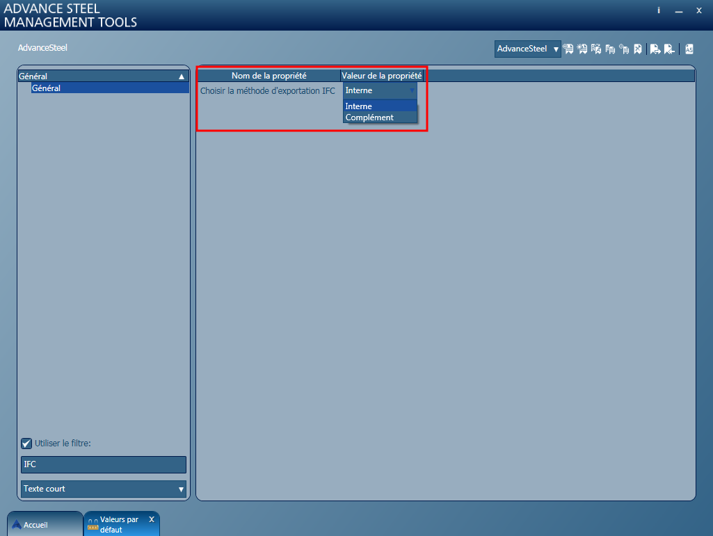 Une nouvelle valeur par défaut a été ajoutée à Management Tools qui vous permet de choisir la méthode d'exportation IFC. Vous pouvez choisir entre la méthode Interne (méthode d'exportation de la version précédente) et celle du complément :