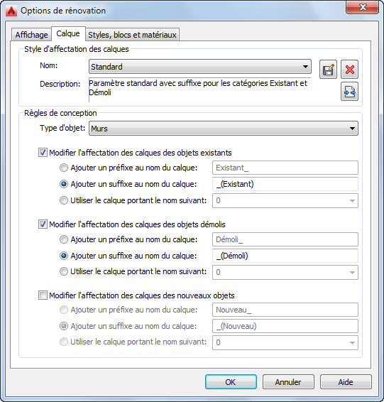 Les règles de conception pour les affectations de calques peuvent être modifiées par le type et la catégorie d'objet. Vous pouvez décider de l'ajout d'un préfixe ou d'un suffixe au nom du calque au lieu de changer son nom. Ces paramètres peuvent être enregistrés dans le style d'affectation des calques de la boîte de dialogue Options de rénovation.