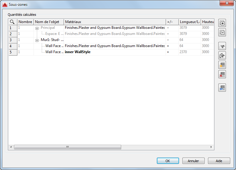 La boîte de dialogue Sous-zones répertorie toutes les zones subordonnées calculées pour l'objet principal. Des sous-zones telles que les ouvertures (fenêtres ou portes) dans les murs sont automatiquement détectées par le système et calculées suivant les règles définies dans les paramètres de calcul. Vous pouvez définir manuellement (ajouter ou soustraire) des sous-zones.
