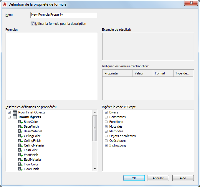 Le nom des définitions de propriétés utilisé dans la formule s'affiche entre parenthèses (ex. :[Largeur]). Si la définition de propriété appartient à une définition de jeu de propriétés autre que celle contenant la formule, son nom est également affiché (ex. : [ObjetsPorte:Hauteur]).