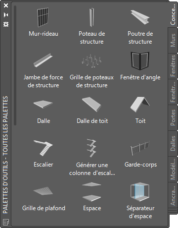 Les palettes personnalisées créées par votre gestionnaire CAO ou d'autres utilisateurs peuvent également contenir des outils de garde-corps avec des propriétés et des styles de garde-corps personnalisés pour vos projets ou vos normes professionnelles.
