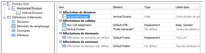 Chaque grille est dotée de ses propres affectations de cellules. Les affectations de cellules peuvent être définies pour inclure dans les cellules une autre grille, un élément de remplissage de panneau ou un objet tel qu'une fenêtre ou une porte.