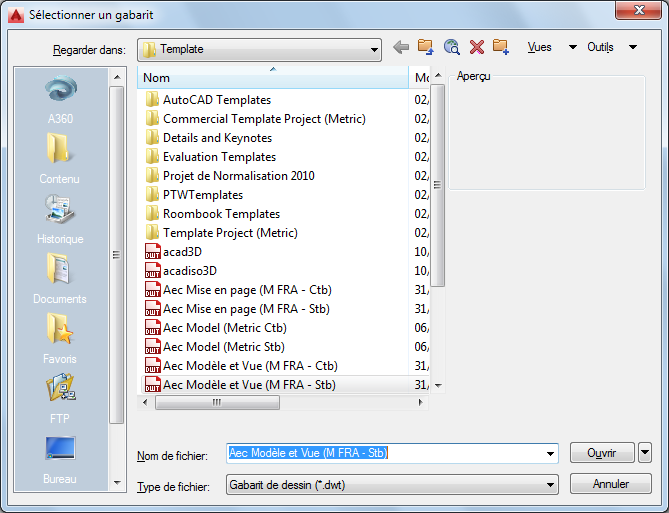 Les gabarits de dessin fournis avec le programme se trouvent sous C:\ProgramData\Autodesk\ACA <version>\fra\Template. Les fichiers de gabarit portent l'extension DWT.