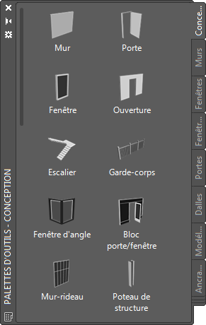 Les palettes personnalisées créées par votre gestionnaire CAO ou d'autres utilisateurs peuvent également contenir des outils d'ouvertures avec des propriétés personnalisées en fonction de vos projets ou de vos normes professionnelles.