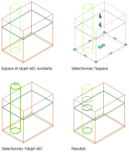 Cette procédure permet de placer des objets, tels que des masses élémentaires, dans un espace pour y créer des ouvertures ou des découpes personnalisées. Par exemple, une structure de grille de poteaux peut contenir des poteaux dans l'espace. Une fois définis en tant que conditions d'interférence, les poteaux permettent de détourer une aire au niveau du plancher et du plafond de l'espace.