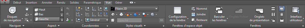 L'onglet Vue permet de définir et modifier les vues et de naviguer dans le dessin depuis un emplacement centralisé.
