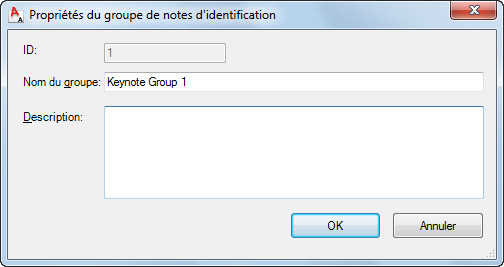 La boîte de dialogue Propriétés du groupe de notes d'identification s'affiche avec le champ d'ID (en lecture seule) indiquant l'identificateur de la base de données pour le groupe que vous modifiez.