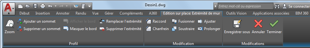 L'édition sur place est un mode d'édition spéciale qui permet de modifier à l'écran les composants d'objets basés sur des profils ou des polylignes en restreignant l'accès à d'autres fonctions d'édition dans le dessin. Par exemple, en mode d'édition sur place, vous pouvez modifier une extrémité de mur, mais vous ne pouvez pas enregistrer ni fermer le dessin. Lorsque vous quittez le mode d'édition sur place, vous devez choisir entre ignorer les modifications apportées, remplacer la définition de composant existante ou l'enregistrer en tant que nouvelle définition de composant.