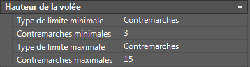 Cette procédure permet de changer les limites s'appliquant à la volée d'escalier. Il est possible de n'appliquer aucune limite ou d'appliquer des limites déterminées par un nombre minimal de contremarches, une hauteur minimale, un nombre maximal de contremarches ou une hauteur maximale.