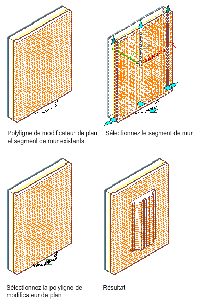 Cette procédure permet de créer un modificateur de mur à partir d'une polyligne ouverte. Vous pouvez tracer la polyligne à l'emplacement du modificateur de mur ou projeter le modificateur créé sur le mur. La polyligne ne peut pas être fermée.