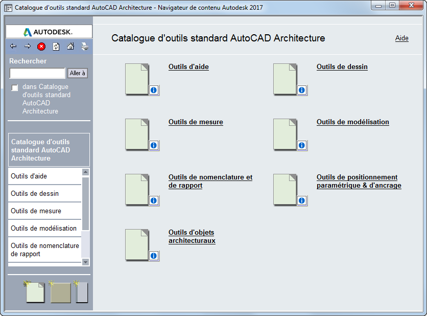 Il suffit de cliquer dessus pour faire glisser un outil ou un autre élément de catalogue vers l'espace de travail d'AutoCAD Architecture 2014 ou vers un autre catalogue, une autre palette ou un autre ensemble d'outils.