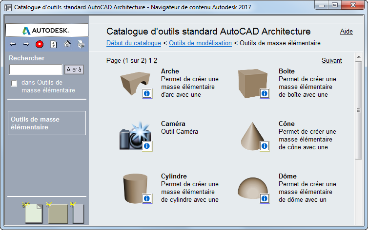 Une catégorie de catalogue d'outils peut contenir plusieurs éléments sur une même page. Si plusieurs pages sont nécessaires, des commandes de navigation apparaissent en haut et en bas de chacune d'elles. La catégorie d'outils de masse élémentaire mentionnée plus haut affiche son contenu sur deux pages. Vous pouvez spécifier la page à afficher en cliquant sur son numéro ou en cliquant sur Suivante ou Précédente. Notez que ces boutons de commande apparaissent aussi en bas de la page. Vous pouvez également changer le nombre des éléments qui s'affichent dans une page du Navigateur de contenu.