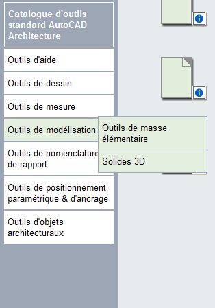 Les catégories peuvent être divisées en plusieurs niveaux. Si une catégorie contient des sous-catégories, leur liste s'affiche lorsque vous déplacez le curseur sur le nom de la catégorie dans le volet gauche. Par exemple, dans le Catalogue d'outils standard, positionnez le pointeur sur les outils de modélisation pour visualiser les sous-catégories d'outils de masse élémentaire et de solides 3D.