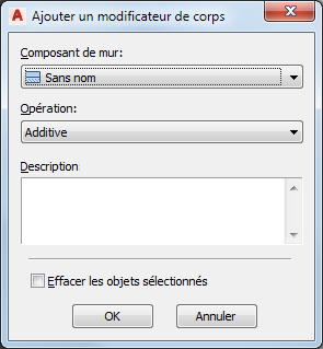 Vous pouvez créer un modificateur de corps à partir d'une masse élémentaire, d'un groupe de masses ou de tout autre objet AEC doté d'une masse. Il est également possible de créer des modificateurs de corps à partir de solides ACIS ou de blocs formant des corps 3D. Vous devez placer l'objet à l'emplacement de votre choix sur le dessin avant de définir l'objet comme modificateur de corps.