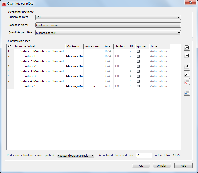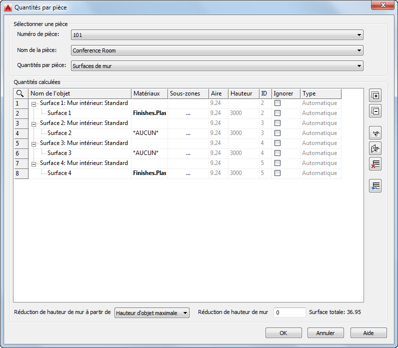 Lors du calcul de matériaux pour des surfaces de mur intérieures de pièces uniques afin de déterminer le plâtre ou la peinture nécessaire, vous devez prendre en compte les plafonds réfléchis, les calques de dalles supplémentaires ou les plinthes qui ne sont pas affichés dans le dessin. Deux options sont disponibles :