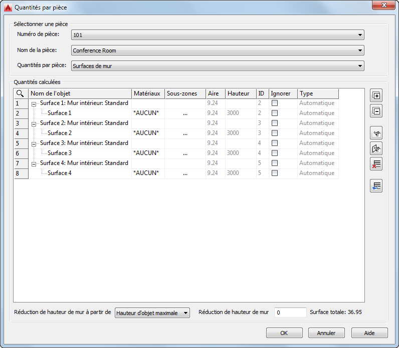 Toutes les surfaces de mur de la pièce sélectionnée sont répertoriées dans la liste. La hauteur est affichée pour chaque objet et chaque face.