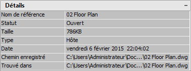 - Trouvé dans indique le chemin dans lequel la Xréf a été trouvée. Si aucun chemin n'a été enregistré pour la Xréf, ou si la Xréf ne se trouve plus dans le chemin spécifié, l'emplacement actuel de la Xréf s'affiche dans ce champ.