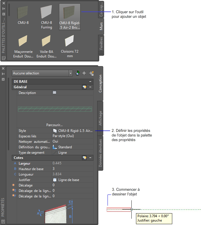 Remarque : Certaines valeurs peuvent être définies uniquement lors de l'insertion de l'objet. Par exemple, la position d'une porte le long du mur ne peut être définie qu'au moment de son insertion. Il n'est pas possible de changer ultérieurement la position d'une porte existante. Les valeurs qui ne peuvent être définies qu'à l'insertion sont repérées par le symbole