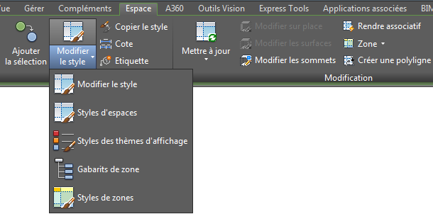 En fonction de l'objet sélectionné, il se peut que vous ayez aussi accès aux styles d'objets pouvant servir de soutien. Par exemple, après avoir sélectionné un espace, vous avez accès aux styles d'espaces, aux styles de zones, aux gabarits de zones et aux styles de thèmes d'affichage.