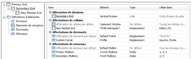 Cette procédure permet de créer une grille imbriquée dans un mur-rideau. Une grille imbriquée est une grille qui se trouve au sein d'une autre. Chaque grille imbriquée est dotée de ses propres divisions, affectations de cellule, dormants et meneaux. Par défaut, le dormant est désactivé pour les grilles imbriquées.