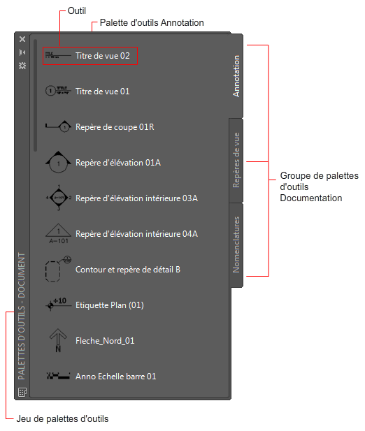 Bien que vous puissiez définir différentes palettes d'outils pour différents profils utilisateur, il n'est possible d'activer qu'un seul jeu de palettes d'outils à la fois lors d'une session AutoCAD Architecture. Lorsque ce profil est utilisé, les palettes d'outils rassemblées sont associées en un jeu de palettes d'outils unique.