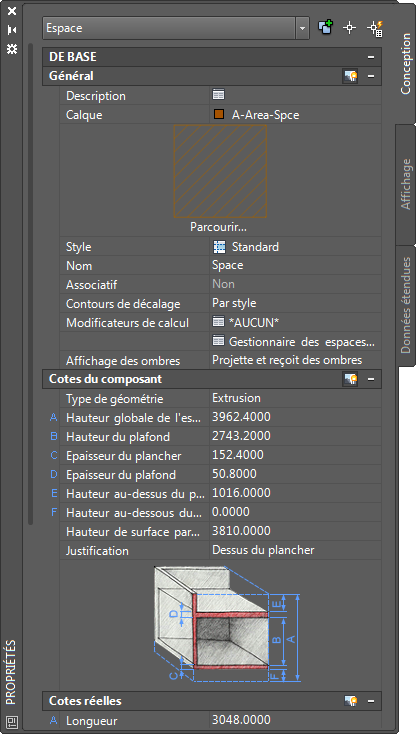- Pour appliquer le modificateur aux contours net, utilisable et brut d'un espace, prévoyez une définition de jeu de propriétés contenant des propriétés pour les valeurs d'aire et de périmètre calculées des contours en question.