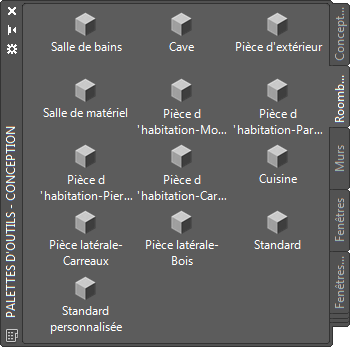 La palette d'outils Roombook contient différents styles de matériaux de surface. Les commandes sont liées au fichier Roombook styles.dwg.