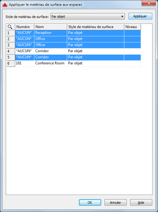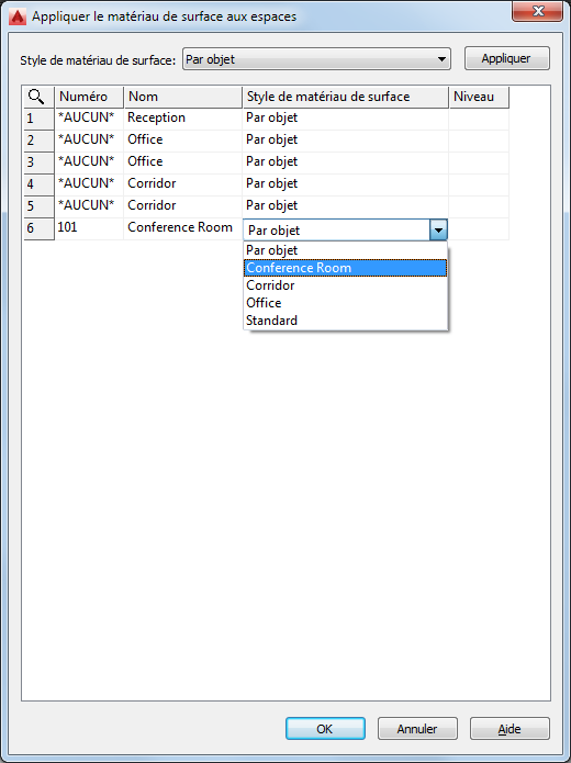 2. Dans la boîte de dialogue Appliquer le matériau de surface aux espaces, choisissez le style voulu et cliquez sur Appliquer.